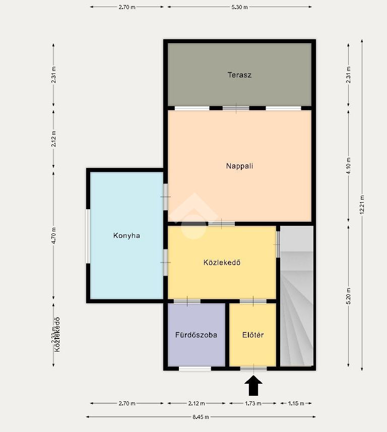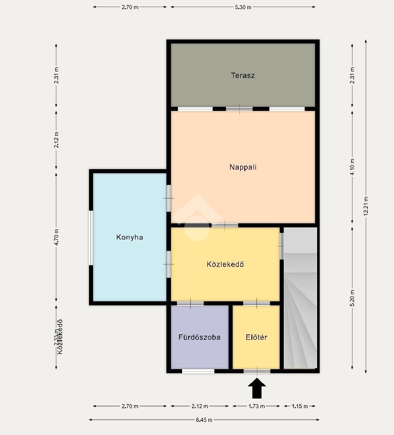 A földszinti közlekedőből közelíthetjük meg a fürdőszobát, a tágas és ablakos konyhát, illetve az impozáns nappalit, ahonnan a 220nm-es privát kertbe léphetünk ki.